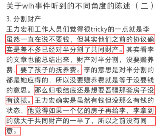 分割财产:王力宏和工作人员们觉得很奇怪的一点就是李靓蕾虽然一直在说不要钱,但其实他们之前的协议确实是差不多已经对半分割了共同财产。李靓蕾归根结底还是想要吾疆那套房子,王力宏觉得如果一个亿的房子再给李,李拿到的就大于共同财产的一半了,所以之前没有同意。