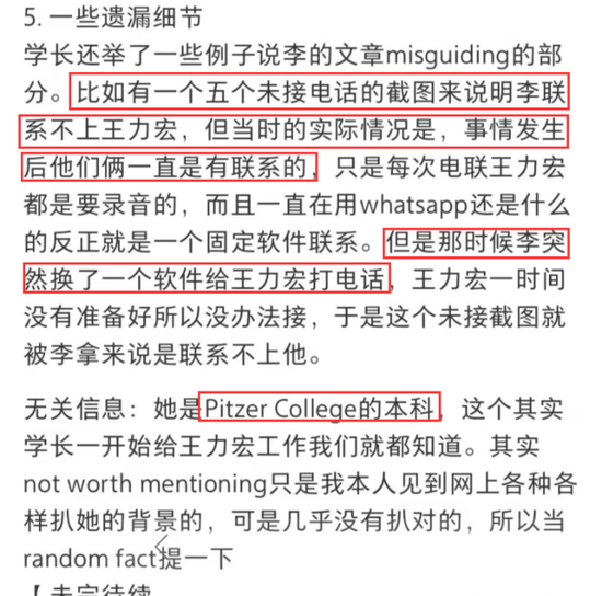 一些遗漏细节:关于五个未接电话的截图来说明李联系不上王力宏,但当时的实际情况是,事情发生后他们俩一直是有联系的,只是每次电联王力宏都是要录音的,但是那时候李突然换了一个软件给王力宏打电话,王力宏一时间没有准备好所以没办法接,于是这个未接截图就被李拿来说是联系不上他。