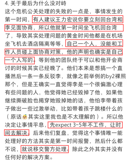 关于最后为什么没对峙:事情发生的第一时间,有人建议王力宏说你要立刻回台和李靓蕾见面协商,所以他就第一时间坐飞机回台,导致其实处理问题的黄金时间他都是在机场坐飞机去酒店隔离等等,自己一个人,没能和工作人员碰上面协商对策,他的声明也确实是自己一个人写的,等到他的团队终于可以和他开会商讨的时候其实已经晚了。