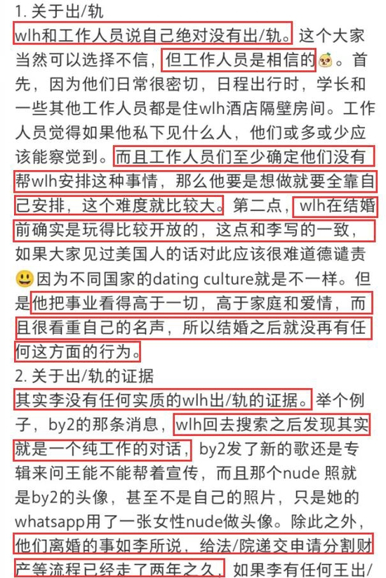 关于出轨的证据:工作人员指其实李靓蕾没有任何实质的王力宏出轨的证据。by2妹妹的那条消息,王力宏回去搜索之后发现其实就是一个纯工作的对话,by2发了新的歌还是专辑来问王能不能帮着宣传,那个李靓蕾晒出的头像,甚至不是孙雨的照片,只是她的用了一张女性照做头像。