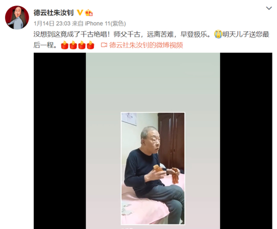 早在1月14日晚上,朱汝钊分享了一段耿伯春先生生前说快板的短片,透露了耿伯春先生去世的消息:“没想到这竟成了千古绝唱!师父千古,远离苦难,早登极乐。明天儿子送您最后一程。”,字里行间不难看出,朱汝钊和师父耿伯春关系十分深厚,如同父子一般亲密无间。