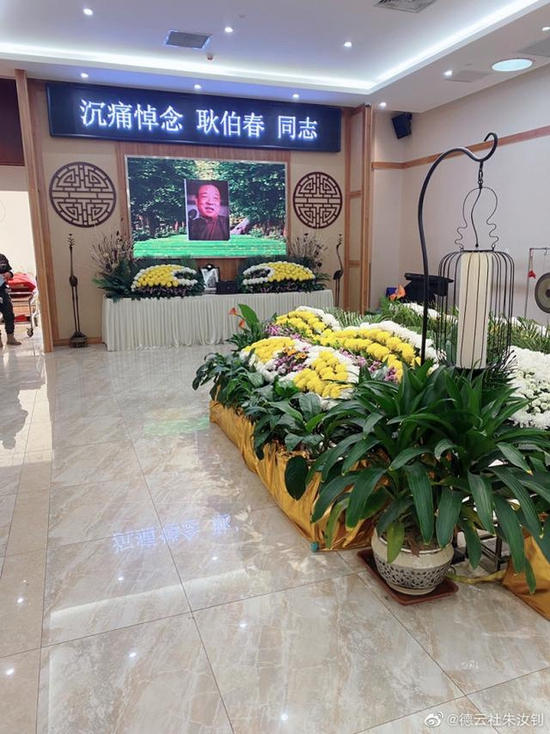 耿伯春先生的灵堂布置得比较简单。里面摆满了黄白相间的鲜花,大屏幕正中是耿伯春先生的遗像,