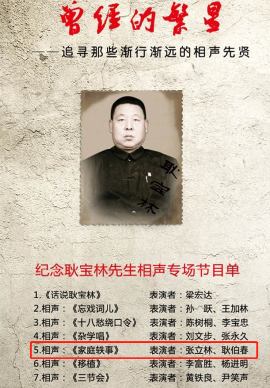 除了张立林之外,耿伯春先生和马志明、卢福来、赵津生等老艺术家也都有过长期合作。代表作品包括《武松打店》《楼上楼下》《大家和我说相声》《铃铛谱》《树没叶》《写春联》《拉洋片》《白事会》《铁甲将军》等等。