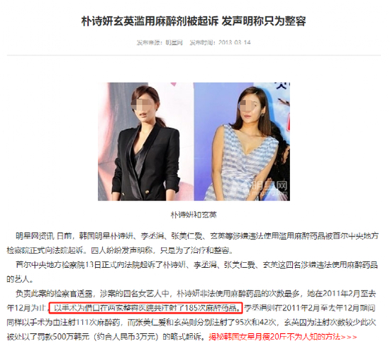 据韩媒报道,她自2011年2月起,就以美容为借口注射185次麻醉药品。