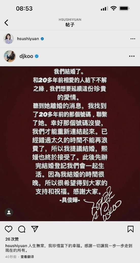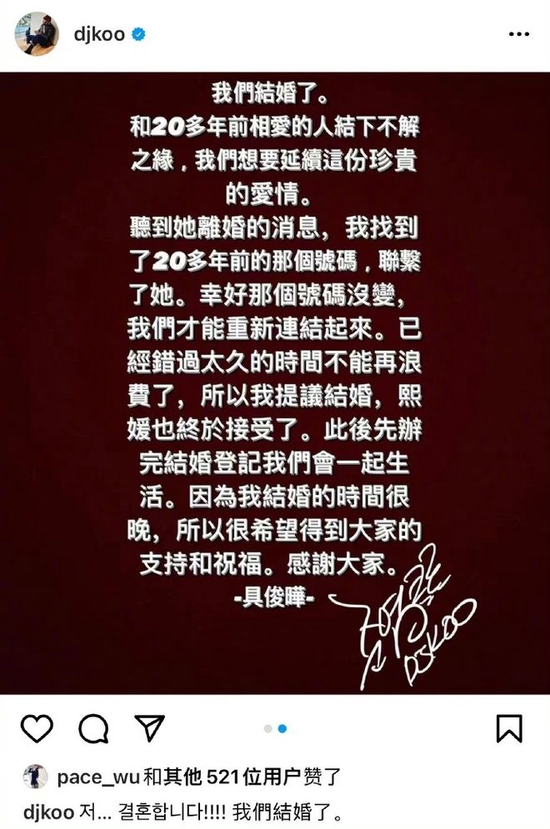具俊晔写道:“我要结婚了,想和20年前相爱的女人延续爱情,听到她离婚的消息,我找到了20年前的那个号码联系了她。幸好那个号码没变,我们才能重新连接起来,时间已经过去很久,不能再浪费了,所以我提议结婚,她也接受了,决定一起生活……希望大家多多支持和祝福,谢谢。”