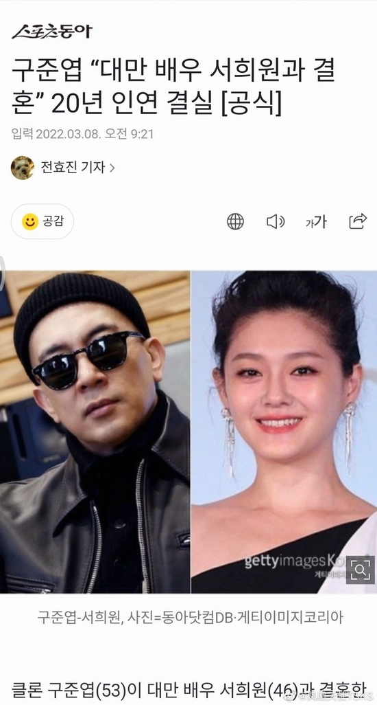 据韩媒报道,Clon组合的具俊晔和大S徐熙媛最近完成了结婚登记。TV Daily于本月初确认了两人成为合法夫妻的事实。具俊晔计划不久后前往妻子所在的中国台湾,在当地也进行结婚登记。
