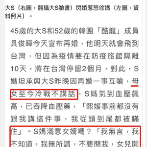 S妈接受采访,表示从头到尾都被瞒住,气到血压飙高。S妈说:“大S这段婚姻和上一段一样,当初她和汪小菲登记结婚时,也没跟我讲,我连小菲的面都没见过,这次情况一模一样,这位韩国人我不认识。”目前,S妈在生大S的气。