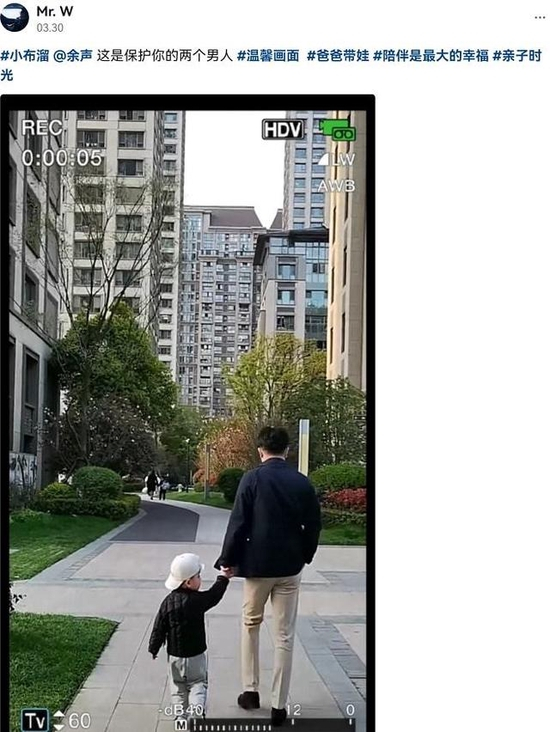 譬如3月30日,魏鹏发了一条他和儿子走在小区路上的背影视频,还艾特余声写着“这是保护你的两个男人”,余声当下很是感动,跑过去回复:“泪目”,魏鹏也点赞了余声的留言。