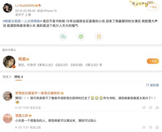 令人意外的是,在杨紫官宣了主演后,桐华的书粉们非但没有不满,反倒一副欣喜的样子: