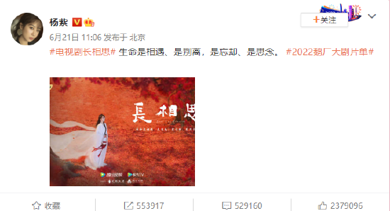 其实,这部剧除了杨紫,还有三位男主演,但就连长相思的官微发出的海报上,也是只有杨紫一人,可见这是一部妥妥的大ip剧了。