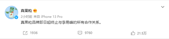 17:59 真果粒品牌宣布终止与李易峰的所有合作关系;