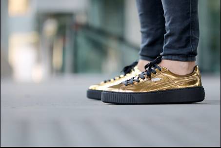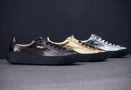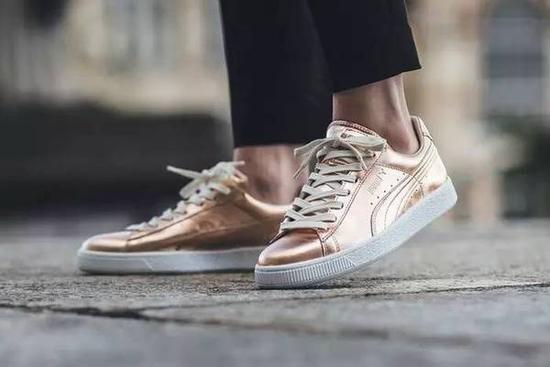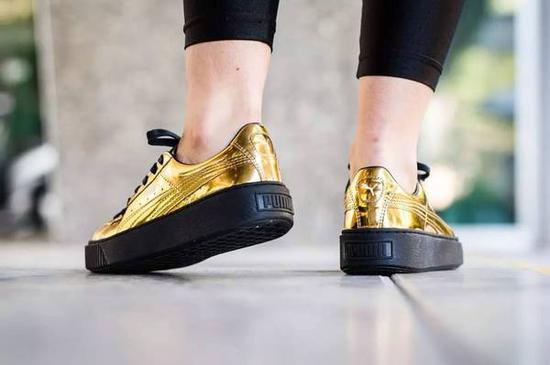 说真的,做成金属风的运动鞋同样也很少。不过 PUMA 很会尝试,顺应时势出了这一系列,虽然看起来个性十足,但是好在金属色得恰到好处,和厚鞋底的板鞋鞋型也显得格外相衬,把一双简单的运动鞋做出了高街的感觉,很有质感的酷。