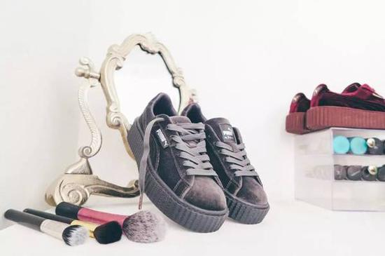 比如说——丝绒。今年大火的丝绒元素已经快被设计师们玩转,你可以在连衣裙,吊带,长靴……等各种单品上见到它们的影子。不过将它用到运动鞋上的,PUMA 也算比较领先的吧。丝绒的优雅温柔恰巧和经典板鞋的运动风中和,展现出一种不一样的魅力。