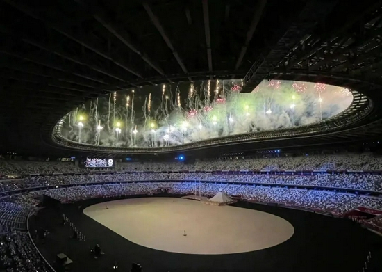 开幕式的烟花腾空飞起,照应出东京国立竞技场空空荡荡的观众席。