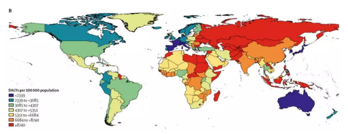 这项研究发布了一张“因饮食结构问题引发的死亡率的世界形势图”。