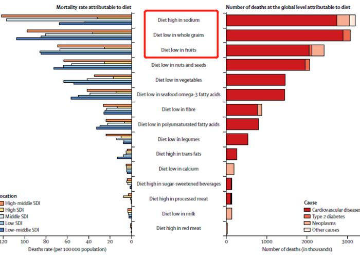 2019年,世界权威医学期刊《柳叶刀》曾经发布了全球饮食领域的大规模重磅研究。它覆盖全球195个国家、时间跨度近30年,分析了世界各国因为饮食结构导致的死亡率和疾病发生率。①