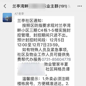 据潇湘晨报,12月5日下午,长沙岳麓区兰亭湾畔小区群内业主分享了一张通知截图,该通知由兰亭社区发出:按照区防指要求现对兰亭湾畔小区三期C4栋1-5楼实施封控管理,封控期间只进不出。