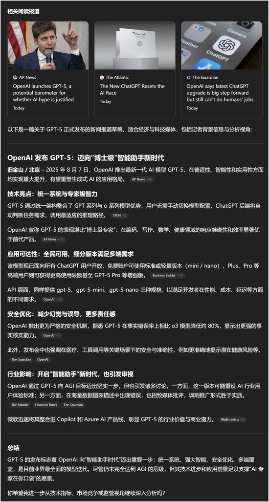 首先,在写作能力上,尽管OpenAI声称GPT-5的文笔更具“人味儿”,但有用户在体验后直言,其写作能力甚至“退化到和GPT-3.5差不多”。每经记者也要求GPT-5就本场发布会撰写一篇新闻报道,最直观的感受是:其输出的文章逻辑清晰,但遣词造句的模式化痕迹明显,“AI味”比以前更重了。