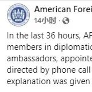 声明表示,在过去36小时内,该协会从美国驻世界各地的外交机构收到的可靠报告显示,多名在拜登政府时期任命的驻外大使接到电话,被要求在明年1月15日或16日之前离职。对方并未对要求这些大使离职给予任何解释。
