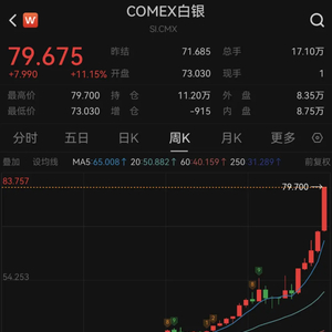 本周,白银价格上演史诗级暴涨,COMEX白银期货周五暴涨超11%,现货白银暴涨超10%,再创历史新高,年内累计涨幅达175%,迅猛涨势远超黄金。在近期暴涨后,现货白银价格已升至每盎司79.19美元;与此同时,美国WTI原油期货价格收于每桶56.93美元。