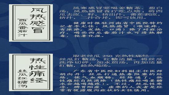 7、 风热感冒——西瓜番茄汁 8、 热性痛经——丝瓜红糖汤