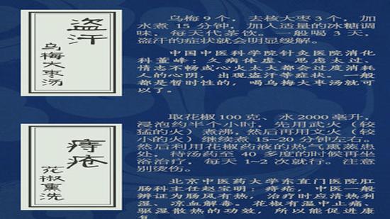 4、 颈椎受寒疼痛——枕热水袋 5、 盗汗——乌梅大枣汤 6、 痔疮——花椒熏洗