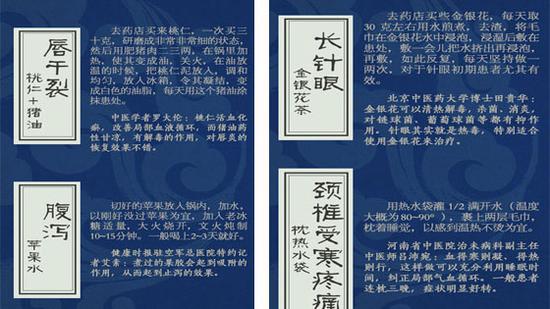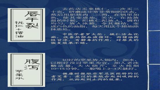 1、 唇干裂——桃仁+猪油 2、 腹泻——苹果水 3、 长针眼——金银花茶