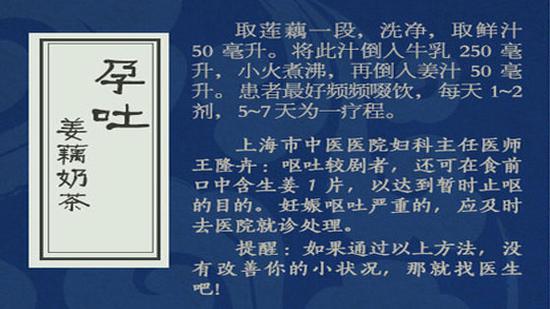 12、胃酸胃胀——醋泡生姜 13、脾胃虚弱——醪糟鸡蛋汤 14、孕吐——姜藕奶茶