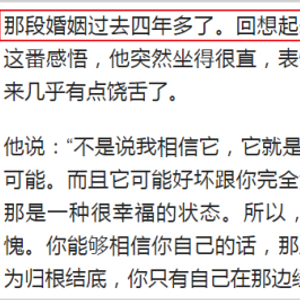 近日王宝强接受采访,在离婚后首次公开提起了和马蓉的婚姻。虽然和马蓉的婚姻已经过去四年多的时间,但他想起来最幸福的部分是因为相信。对于这段曾经很美好的婚姻,虽然最后相信破灭了,但是自己做到了问心无愧。可以看得出这段失败的婚姻对王宝强影响很大。