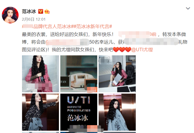 其实最近,范冰冰喜讯不断。除去今天官宣的瑞典代言。上个月还官宣了,一家服饰品牌UTI尤缇的代言。同样,范冰冰亲自几次发博帮助宣传。