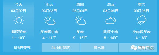 4、昨天上午,南京市气象台发布寒潮蓝色预警信号:受较强冷空气影响,预计未来24小时内南京市最低气温将下降8到10℃,2日早晨最低气温在0到1℃,并伴有陆上5到6级、江河湖面6到7级偏北大风,请注意防范。