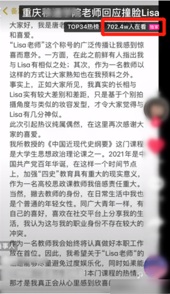 眼看见这个话题的热度越来越高,撞脸Lisa的教师也坐不住了,选择从三个方面回应。