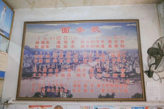 他家的仔姜鸭丝面是特色,色香味俱全。早餐能够吃一两这样的面,真的绝了。老板以前找来的《面条歌》,多年来一直被挂在店里最明显的位置,还挺有趣的。