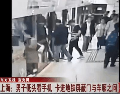 上海一男子坐地铁时低头看手机,没注意到正在关闭的车门,被卡进地铁屏蔽门和车厢之间。
