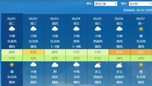 2日白天最高气温:伊春、齐齐哈尔、鹤岗、佳木斯、双鸭山、七台河22~24℃,其它地区19~21℃。
