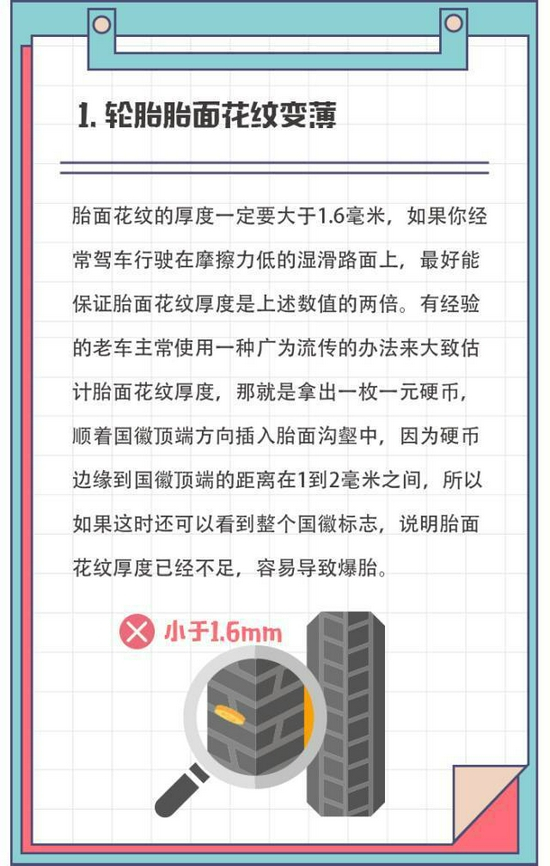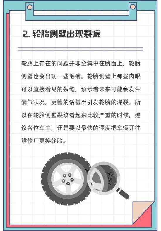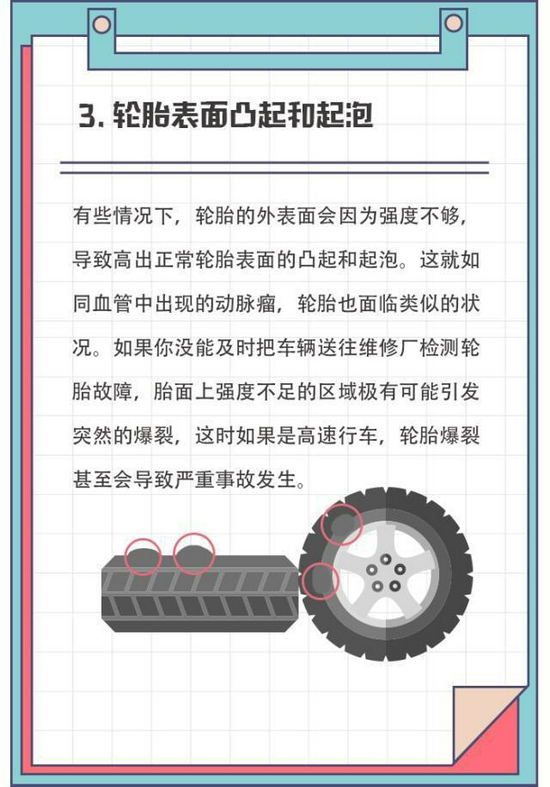 每一只轮胎上都有磨损标志,当磨损标志被磨损前,应提早更换轮胎;另外轮胎侧面的裂纹、破损和鼓包也要格外留心,一旦出现破损严重和鼓包就应该马上更换轮胎;