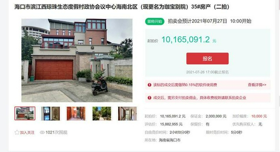 27日上午10点将对7套房产、商铺进行拍卖。三亚市天涯区解放路三亚金水湾7#楼2101房、2102房,两处房产的评估价在350万左右,在平台上的拍卖价在220万余元。截至发稿前,其中一套房的围观人数已有近千人。而房产中起拍价最高的为海口市滨江西琼珠生态度假村政协会议中心海南北区(现更名为珈宝别院)35#房产,起拍价为10165091.2元,评估价为15882955元。海口市府城建国路7号省印刷公司宿舍B栋604房起拍价 716005.76元,评估价为1118759元,但后面注明目前该房有人在居住,腾房需要公安机关强制执行。房产中注明的瑕疵多为未办理不动产权证,拖欠物业费以及存在债务等,其中海口市海甸岛二路水岸阳光B座E栋E2-2-2铺面自2012年11月至2021年3月共欠物业费158630.44元。