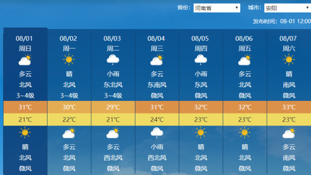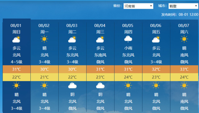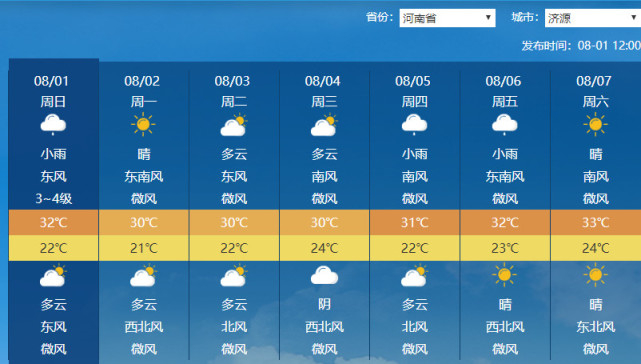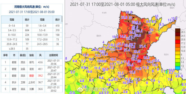 昨天(7月31日)傍晚到夜里,我省沿黄及以北大部地区出现6到8级短时大风,鹤壁、新乡、安阳等地阵风达10到12级,局部13到14级,最大阵风为淇滨姬屯43.6米/秒(14级)。同时,黄河以北出现阵雨、雷阵雨,安阳县、滑县、汤阴、浚县、卫辉出现中到大雨,地市平均最大降水量为鹤壁15.6毫米,最大降水站点为卫辉上乐村50.8毫米。