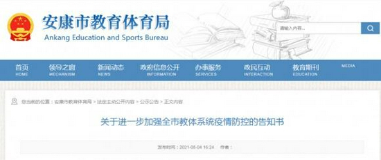 各位教职员工,各位家长、同学们: 当前,随着传播力和传染性较强的德尔塔毒株肆虐,全球疫情仍处于高位流行。国内多省相继出现本土新增新冠肺炎确诊病例和无症状感染者,疫情传播速度快、扩散风险高,防控态势再次紧张。为了全力做好教体系统新冠肺炎疫情防控工作,降低传播风险,保障全市师生、家长健康安全,坚决防止疫情反弹,从即日起,全市教体系统要进一步落实有关疫情防控措施,现告知如下: 一、落实防控措施 1。出入公共场所及封闭的公共交通工具及电梯时全程佩戴口罩,尽量避免乘坐拥挤的电梯。 2。保持个人卫生,自觉做好个人防护,养成“戴口罩、勤洗手、常清洁、常通风、公筷制、分餐制,少聚集、一米线”等良好卫生习惯,减少到人员密集场所、空气流动性差的地方活动,不扎堆、不聚集。 3。一旦出现发热、干咳、乏力、咽痛、嗅觉减退、腹泻等不适症状,务必在做好个人防护前提下,到发热门诊就诊,并主动告知接诊医师旅居史及活动轨迹。 二、严格人员管理 1。严格做好假期健康监测和外出请假报备制度,畅通沟通联系渠道,准确掌握每名师生员工健康状况和外出行动轨迹。如外出隐瞒不报备而造成疫情传播,个人将承担法律后果。 2。从即日起全市所有师生员工非必要不得前往中高风险地区,不得跨省出行,非必要不离安;秋季开学前14日(8月15日前),所有师生员工要返回学校驻地,并做好日常体温和身体状况监测,符合防控要求后方可返校。 3。全体师生员工去过或途经国内疫情中高风险地区,返回安康后第一时间向所在社区(村)和学校报备相关情况,按照属地疾控部门要求,严格落实医学观察、健康监测及核酸检测等各项疫情管控措施。未经学校允许不得返校。 三、强化校园防控 1。暑假期间,全市各级各类学校实行封闭管理,师生员工和确需入校的外来人员进出必须核验身份、查验体温并出示健康码、行程卡,符合要求后方可入校,其他校外无关人员一律不准入校。中职学校要加强学生实习实训管理,不得安排学生到中高风险地区实习;对市校合作来我市实习实训的大学生,接收学校要落实落细疫情防控相关措施,不得出现监管盲区和漏洞。 2。从严做好聚集性会议活动管控。全市教体系统原则上不再举办或承办各类线下大型会议、活动。确需举办的,要落实举办方主体责任,压缩规模、控制人数(原则上不超过100人),严格落实测温、戴口罩、核验健康码、通风消毒等防控措施,一律报辖区疫情防控机制(指挥部)审核。 四、强化疫苗接种 1。全体师生员工及学生家长要积极响应国家新冠病毒疫苗接种政策,学校要加强疫苗接种工作宣传动员,按照“属地管理、就近方便、知情自愿、保障安全”的原则,在县区疫情防控部门的统一安排下,就近到居住地新冠病毒疫苗接种门诊、临时接种点或流动接种点接种,力争做到12-17周岁的学生和学校教职工无禁忌全员接种,共同构建群体免疫屏障。 2。接种过程中,学生应由家长全程陪同,配合接种工作人员做好健康询问和知情告知,避免空腹、劳累,保持放松状态。接种后要做到现场留观30分钟,如出现不适,请及时告知现场医务人员。在第一剂次疫苗接种21天后,请及时接种第二剂次疫苗,尽快完成个体全程免疫。 3。为强化校园疫情防控,确保校园安全,接种新冠病毒疫苗纳入师生到岗入学查验。按照“应接尽接,应接必接”原则,请15-17周岁学生于8月底前、12-14周岁学生9月底前完成全程两剂次接种。接种后要留存好接种凭证,以备开学时查验。无禁忌症且未按期接种疫苗的师生员工将暂缓到岗入学。 为保障全体师生员工健康安全,请严格遵守疫情防控有关要求,共同为全市经济社会持续稳定发展做出应有的贡献。感谢您对我们工作的理解、支持和帮助,衷心祝愿您身体健康、家庭幸福! 安康市卫生健康委员会 安康市教育体育局 2021年8月4日