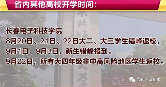 继吉林大学、东北师范大学等7所高校公布开学时间后,目前,另有吉林省11所高校也相继在官方公众号上公布了开学时间,都集中在8月末及9月,但返校在校生和新生的范围,只限所在地域为疫情防控低风险地区。