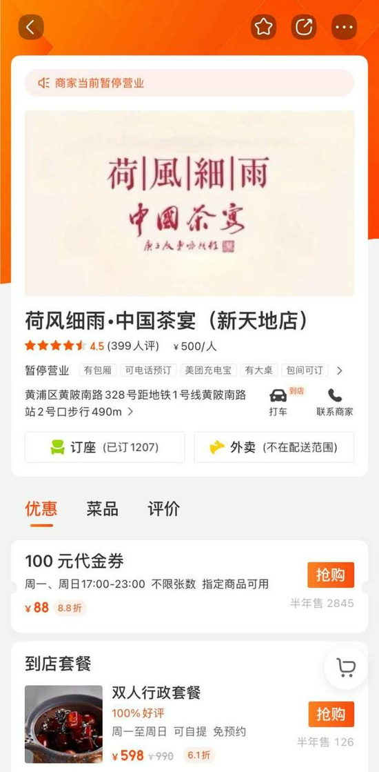 上海新天地的网红餐厅荷风细雨今日被爆出因违规送餐、食品加工操作不当导致多人腹泻、就医,被黄浦区市场监管局查封,并立案调查,受到网友关注。