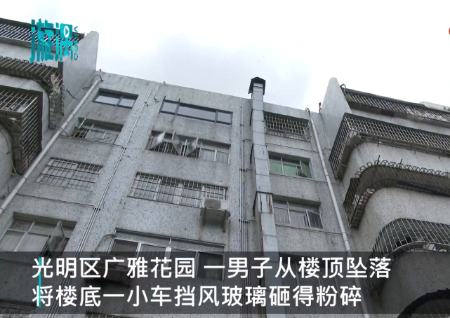 8月29日,广东深圳光明区广雅花园一男子从7楼坠落,将楼底一小车挡风玻璃砸得粉碎。事后,小区居民与保安报警,警方赶到后将该名男子送至医院。