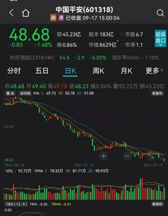 9月17日,中国平安A股H股齐跌,其中H股盘中一度下挫8.54%。截至17日收盘,中国平安A股报48.68元/股,跌1.68%;H股报54.50港元/股,跌5.05%。