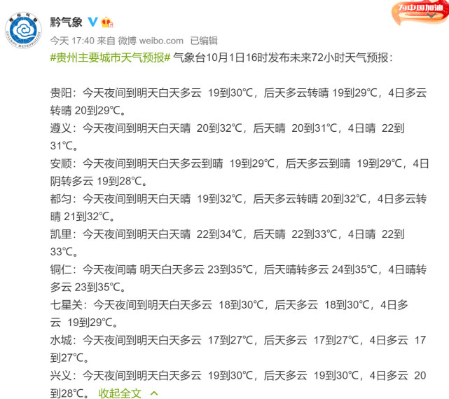 #贵州主要城市天气预报#气象台10月1日16时发布未来72小时天气预报: