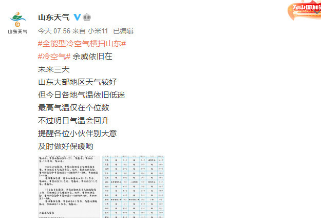 山东天气预报 新浪新闻 新浪新闻官方账号 2021.11.0822:00 关注 冷空气 余威依旧在 未来三天 山东大部地区天气较好 但今日各地气温依旧低迷 最高气温仅在个位数 不过明日气温会回升 提醒各位小伙伴别大意 及时做好保暖哟 来源:山东天气
