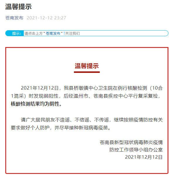2021年12月12日,我县桥墩镇中心卫生院在例行核酸检测(10合1混采)时发现弱阳性,后经温州市、苍南县疾控中心平行复采复检,核酸检测结果均为阴性。