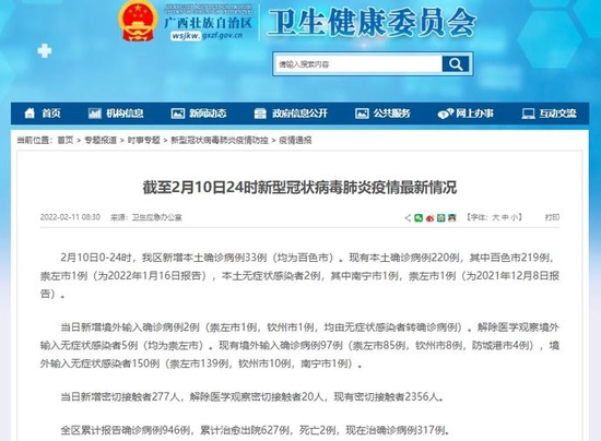 我区新增本土确诊病例33例(均为百色市)。现有本土确诊病例220例