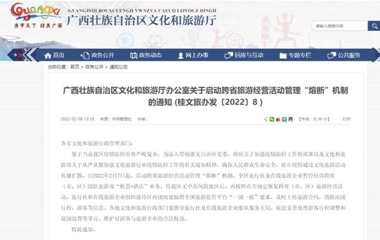 自2022年2月7日起,启动跨省旅游经营活动管理“熔断”机制,全区旅行社及在线旅游企业暂停经营跨省(市、区)团队旅游及“机票+酒店”业务,待我区无中高风险地区后,再按照有关规定恢复跨省(市、区)旅游经营活动。