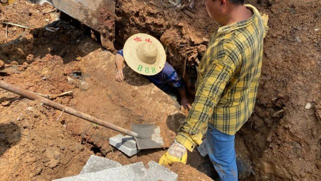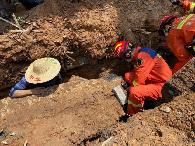 一组消防员做好周边的加固避免土层发生松动给被困男子造成二次伤害,一组消防员对现场实施警戒,一组消防员利用液压破拆工具组展开救援。由于男子腿部被泥土和沙石覆盖无法动弹,而且现场坑道面积小,破拆石板难度极大。消防员立即决定徒手对男子腿部上方的泥土进行铲除,减少男子腿部的压力。期间,救援人员一边安慰男子,一边徒手挖掘救援空间进行救援。