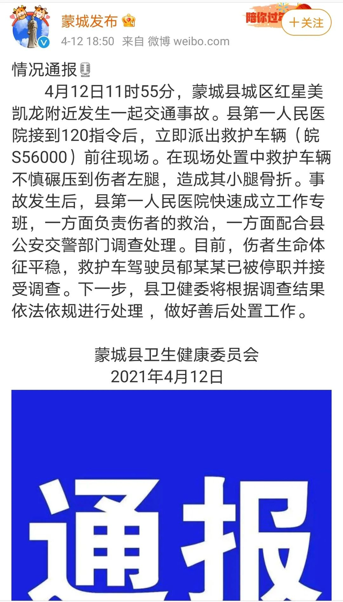 4月12日11时55分,蒙城县城区红星美凯龙附近发生一起交通事故。县第一人民医院接到120指令后,立即派出救护车辆(皖S56000)前往现场。在现场处置中救护车辆不慎碾压到伤者左腿,造成其小腿骨折。事故发生后,县第一人民医院快速成立工作专班,一方面负责伤者的救治,一方面配合县公安交警部门调查处理。目前,伤者生命体征平稳,救护车驾驶员郁某某已被停职并接受调查。下一步,县卫健委将根据调查结果依法依规进行处理 ,做好善后处置工作。